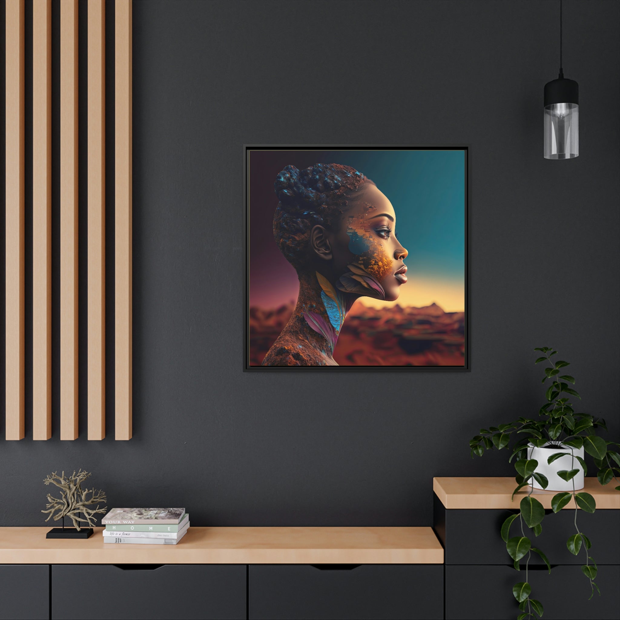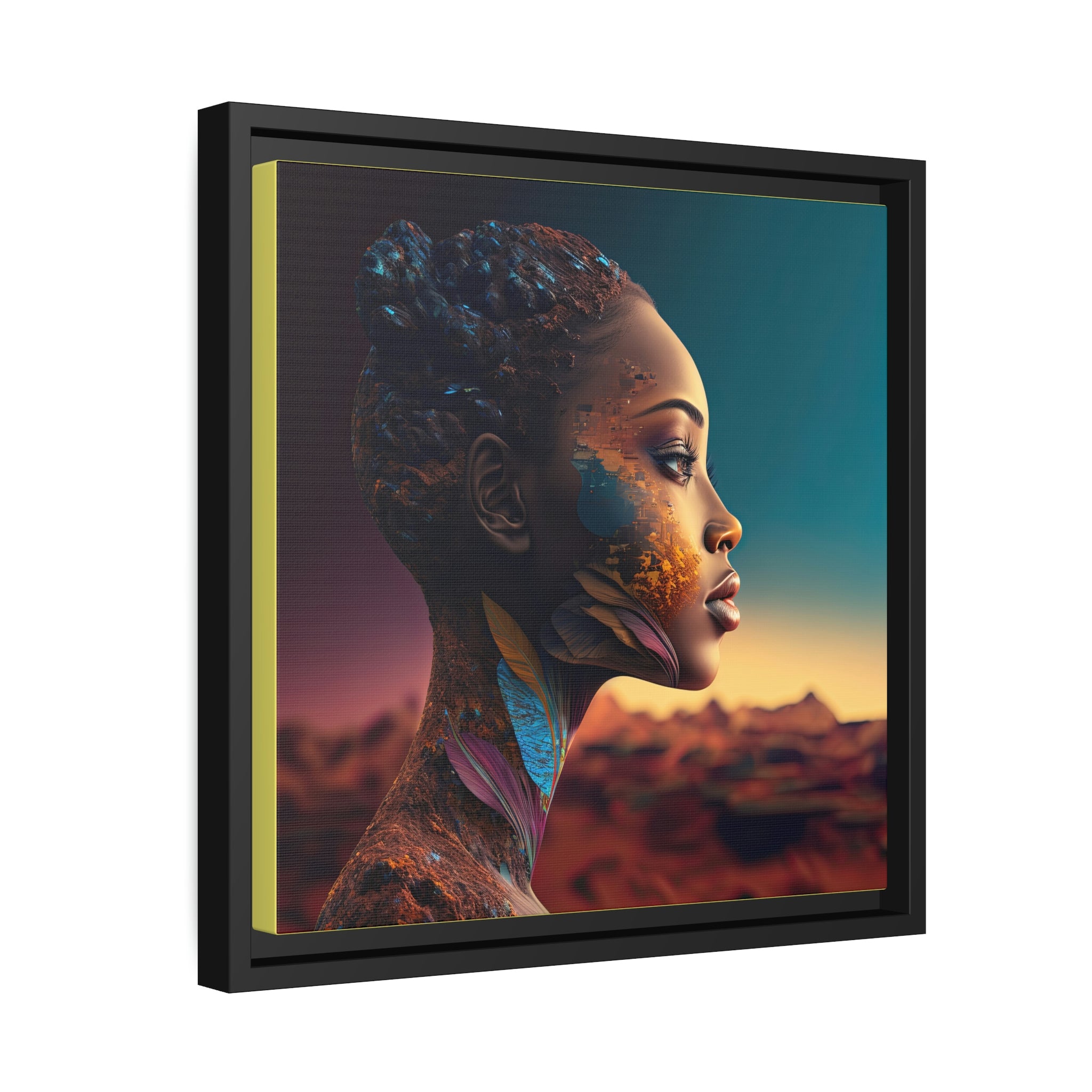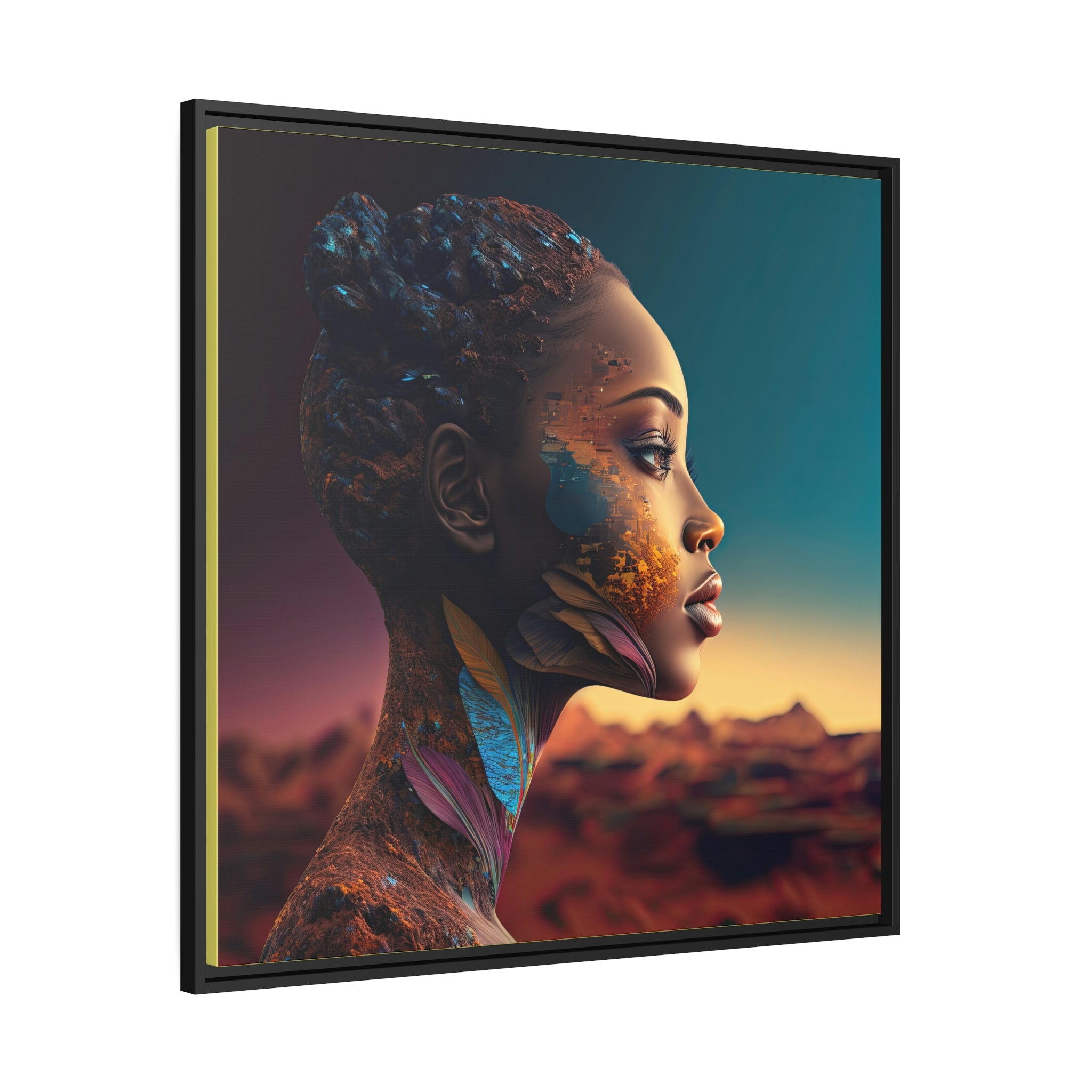 Introducing "Empress Of The Earth", a powerful and captivating portrait piece. This work of art features a dark-skinned woman, depicted in profile, with a regal and commanding gaze. The woman's skin seamlessly blends into an earthen texture as it moves away from her face, creating a harmonious connection with the desert landscape in the background. The use of warm earth tones and the subject's strong and confident presence make this piece a true masterpiece. Whether you're looking to make a statement in your living room or add a touch of elegance to your office, "Empress Of The Earth" is the perfect choice. Let this piece bring its regal presence to your space and let yourself be crowned by the beauty of the "Empress Of The Earth".